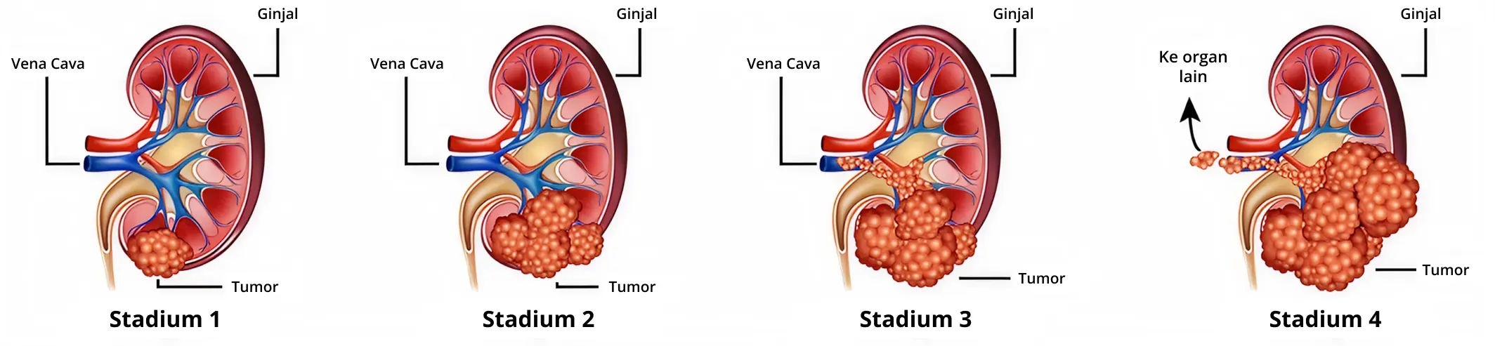 - Stadium IV: Kanker telah menyebar di luar ginjal ke kelenjar adrenal (kelenjar kecil yang berada di atas ginjal), atau ke kelenjar getah bening yang jauh atau organ lain seperti paru-paru, tulang, dan hati. Stadium IV juga dikenal sebagai kanker ginjal stadium lanjut atau metastasis.