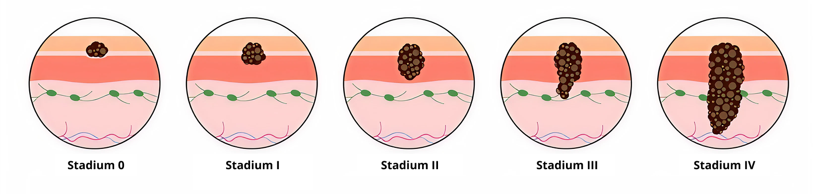 - Stadium 0: Melanoma terdapat di lapisan atas kulit (epidermis). Stadium 0 juga dikenal sebagai melanoma in situ.