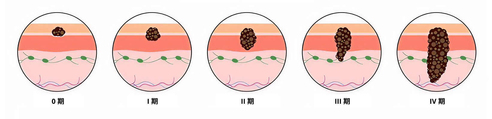 • 0期: 黑色素瘤局限于皮肤的最上层(表皮)。0期又称原位黑色素瘤。