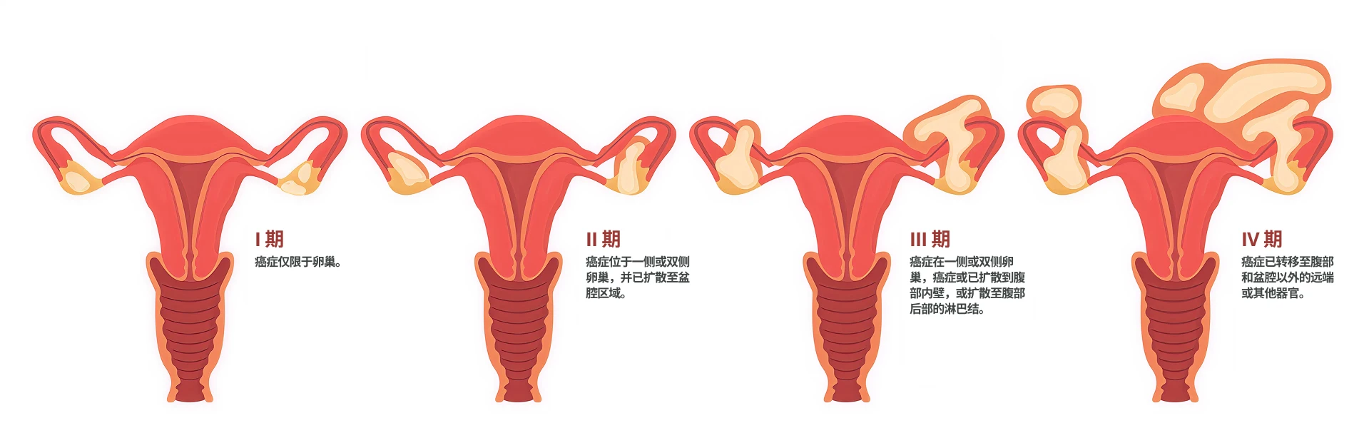- IV期: 癌症已经扩散至距离卵巢较远的其他器官,如肝脏或肺。